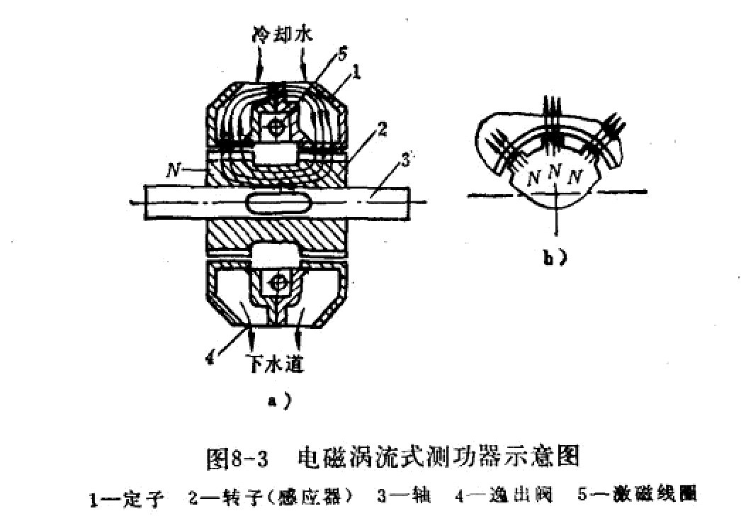 流电动机,也可采用其它发动机。 加载器有机械的(图8-2)、水力的(水力测功器)、电力的和电磁涡流的(图8-3),前三种测功器是常见的,此处不再赞述,下面主要介绍电磁涡流式测功器。
