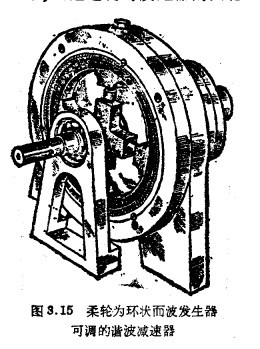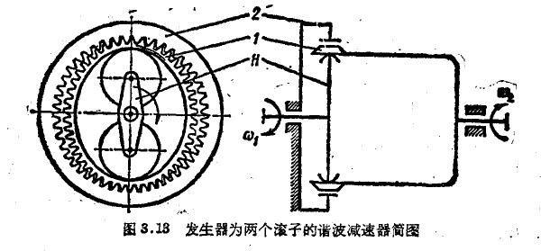 谐波齿轮减速器的变型主要取决于发生器和柔轮的结构。例如图3.13表示自由变形发生器为两个滚子而柔轮为套杯状的谐波减速器简图。