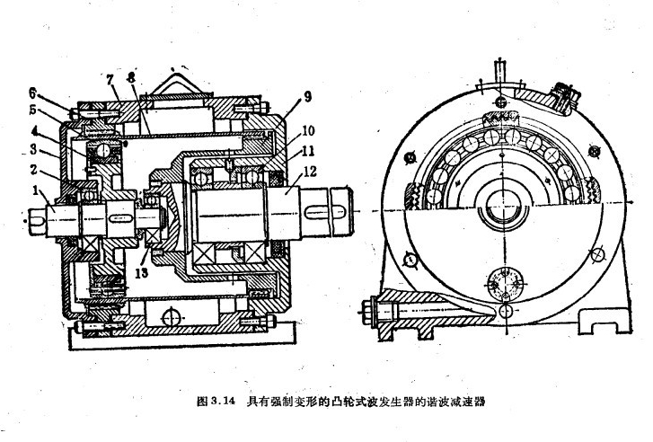 在图3.14所示的谐波减速器结构中,主动轴1转在轴承2和13中,而通过键与发生器的凸轮4相联。在凸轮的成形表面上压有柔性轴承5,它使柔轮8发生变形。在椭圆的长轴上,柔轮轮齿与刚轮6的轮齿相啮合,而刚轮靠螺栓与箱体7及箱盖3固结在一起。在柔轮8的另一端,其内侧也做出轮齿。柔轮通过这些轮齿(类似于齿轮联轴器)与中间套杯9相联,套杯9又与从动轴12固结在一起。轴12装在轴承10中,而轴承10装在与箱体7相联的异形箱盖11中。